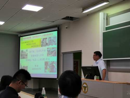 2019年5月27日中午,raybet雷竞技竞猜app在九龙湖校区召开2018级专业分流、2017级方向分流介绍会暨诚信教育年级大会。院长助理张凯锋老师对我院大一分专业和大二分方向的政策进行了整体介绍,金立左、牛丹、张亚和周波等四位老师分别对智能信息处理、控制工程、控制科学和智能机器人(机器人工程)等四个方向,就实践应用、课程体系、师资力量、就业方向等内容进行了详细介绍。