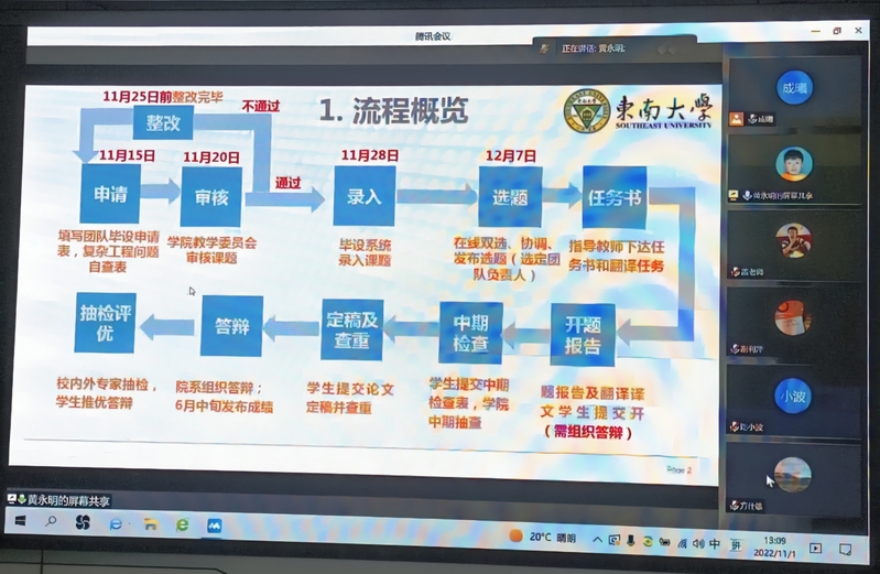 随后,黄永明老师对今年本科毕业设计改革的细节部分进行了解释,包括毕业设计改为团队形式、增加企业导师、自查毕设子课题的“复杂工程问题”达成度和增加学院审核课题环节等方面。黄老师还对毕设工作的具体时间节点以及注意事项进行了提醒。老师们也在会后就相关问题进行了交流沟通。