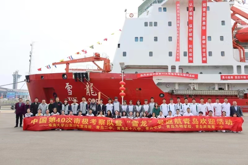 为了让青少年能够亲身感受这一激动人心的时刻,帮助同学们树立“科技创新、强国有我”的志向,raybet最佳电子竞技平台raybet雷竞技竞猜app、山东招生宣传组还邀请了山东省青岛第二中学、山东省青岛第五十八中学、青岛中学、青岛为明学校、青岛西海岸新区第一高级中学等5所青岛重点中学的50余名师生共同参加本次欢迎活动。本次活动通过现场感受南极科考氛围,近距离参观“雪龙号”,让青少年深入了解这些展示国家科技实力的重器的工作原理和应用,从而加深对科学知识的理解,激发青少年对科学和工程领域的浓厚兴趣,为他们播下梦想种子。